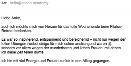 Während meiner Retreats erlebst du intensiven fachlichen und persönlichen Austausch, Motivation und Begleitung mit mir und du bist nicht nur irgendeine Teilnehmerin sondern ich gehe auch in der Gruppe individuell auf dich ein. Durch meine langjährige Erfahrung in der Körperarbeit und mit Menschen habe ich ein Gespür dafür, was du gerade brauchst.